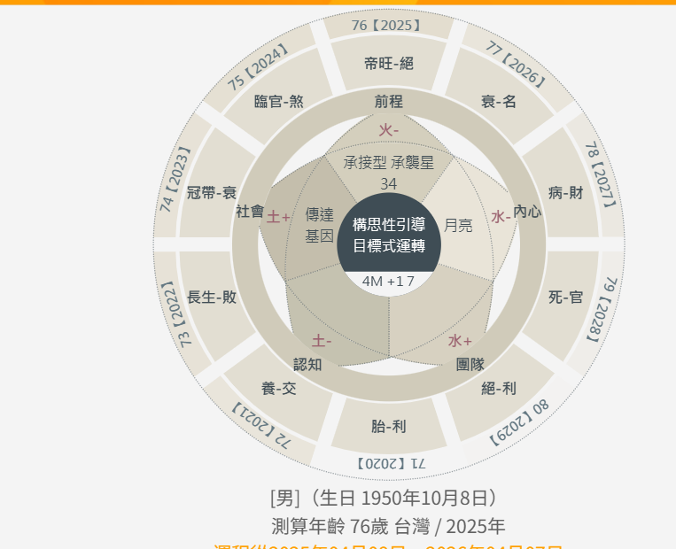 貪婪出現、迷失心性、依賴別人、等待不動,我們稱之為「保守期」,代表您正處於內旋狀態,也就是太過堅持自我心性,並且執著心太盛無法放掉過去,這將造成「恐慌危機」。請參考解運心法調整,並在下一流年持續追蹤檢視。