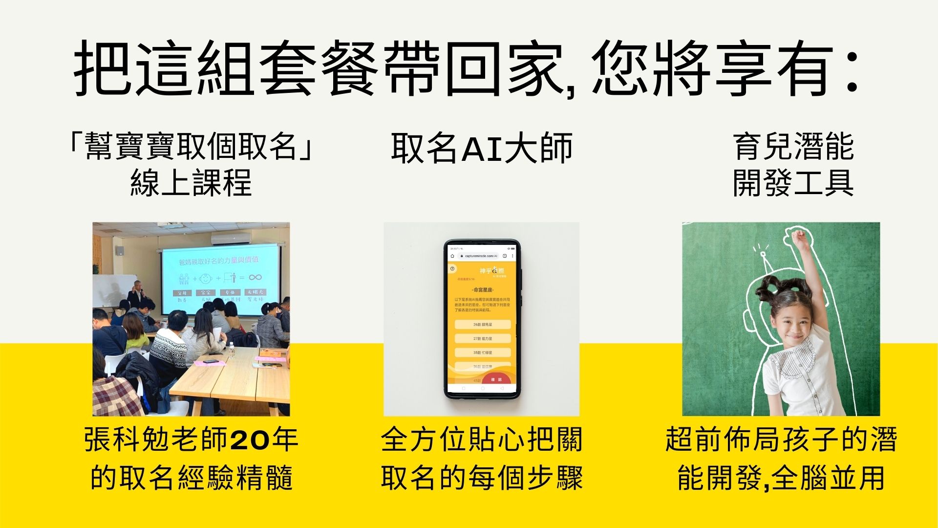 相信所有親取好名的爸媽都一樣,除了祝福,當然更可以透過名字早早開啟孩子的潛能,幫孩子在學習上超前佈局!把「取名AI大師」帶回家的同時,科勉老師還貼心為您準備了「育兒潛能開發」的測算項目,把握孩子的創意思維和創意啟發年。